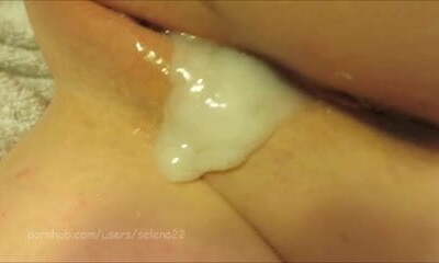 Second cumshot for the night in her wet creamy slit